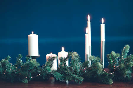 Long thin and wide white burning candles on wooden table with green spruce branch isolated on blue background