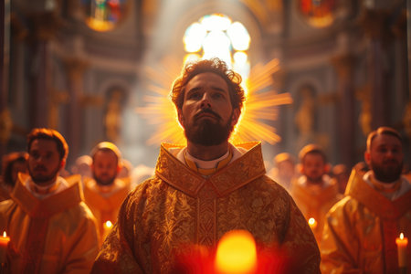 A priest enveloped in golden sunlight within a grand cathedral, his ornate robe detailed against the backdrop of glowing candles and stained glass. priest