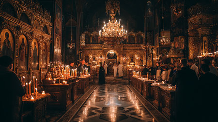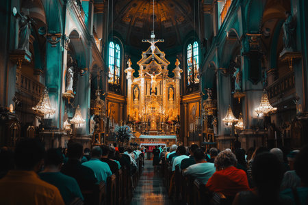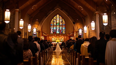 Panoramic View of Good Friday Church Service, Praying Congregation, Stained Glass Glow.