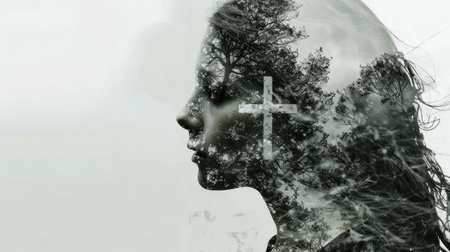 Double exposure of a woman with a cross and trees on her head. Monochrome image.