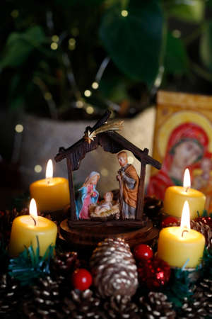 Christmas nativity scene with delicate figures recreating the Christian holiday. Classic Christmas scene lit by candles. Selective focus. Intimate light