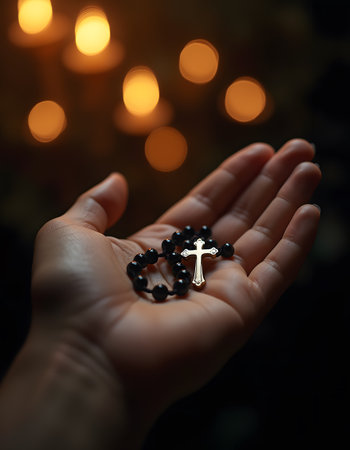 A hand holds a black rosary with candlelight glow.