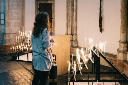 A young woman praying in a church. Horizontal composition