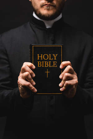 cropped view of priest holding book with holy bible lettering isolated on black