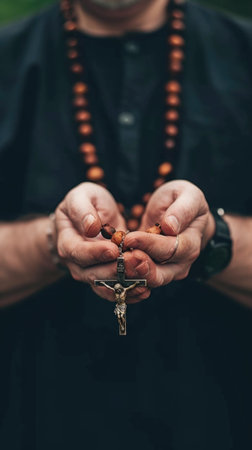 Soulful prayer: a man in quiet devotion, hands clasped around a rosary cross, seeking solace and spiritual connection, capturing the essence of serene contemplation, faith, and religious devotion
