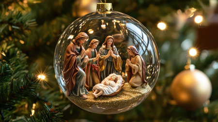A stunning glass Christmas ornament showcases a nativity scene with baby Jesus, surrounded by Mary, Joseph, and angels, capturing the holiday spirit in a beautiful festive tree setting.