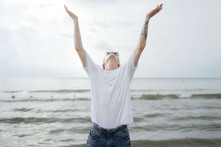 young guy raised his hands looking up, addresses to heaven