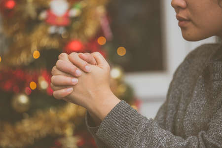 Woman's hand praying and worship to GOD Using hands to pray in religious beliefs and worship christian in the church or in general locations in vintage color tone or copy space.