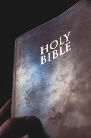 Close up of hand holding holy bible book. Concept of faith, spirituality and religion.