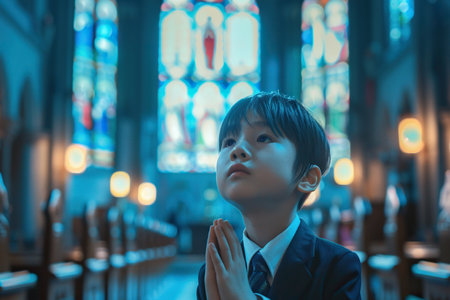 Japanese school boy praying in church. Cinematic effect