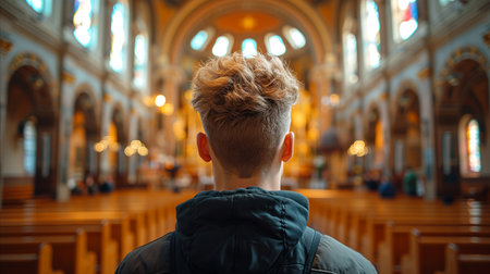 A young man in a coat in a close up Catholic church from the back. Bokeh effect with blur background. Free space on the right to insert text. Concept on the theme of faith, religion and church