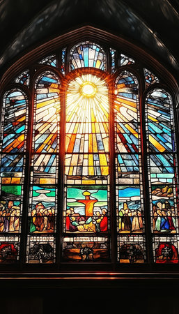 This breathtaking stained glass window showcases intricate biblical scenes, illuminating the elegant interior of a gothic church with vibrant colors and artistic detail.