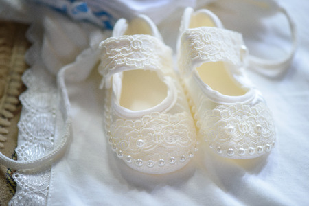 Baby shoes and white dress with golden icon for Christening