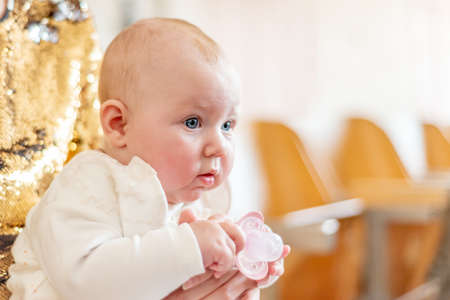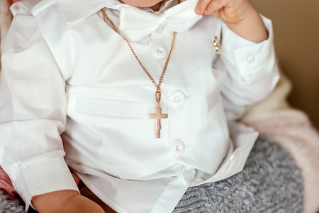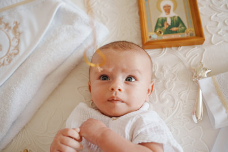 2025.08.16, Russia. Baby dressed in white with golden decoration and icon