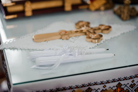 A pair of gold wedding rings and an iron cross on a white background in a church. Wedding ceremony in the church