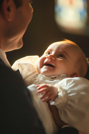 A tender moment of a baptism ceremony showcasing a man holding a baby wrapped in a white cloth with lace details, a priest's hand gently resting on the baby's head.