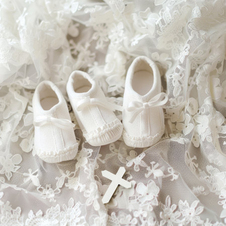 A pair of white baby shoes with lace detail, lying on a lace fabric background with a white cross in the background.