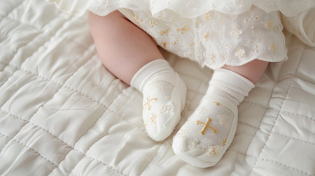 Close up of babys feet wearing white socks with gold crosses during a baptism ceremony.