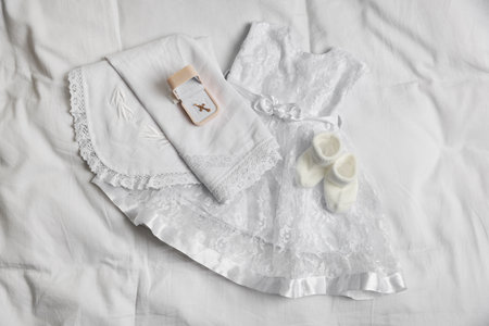 Sacrament of baptism. Box with gold cross, dress, boots and christening towel on bed, flat lay