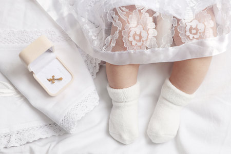 Baby shoes and white dress with golden cross for Christening
