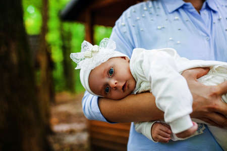Child in the arms of the grandmother at a baptism
