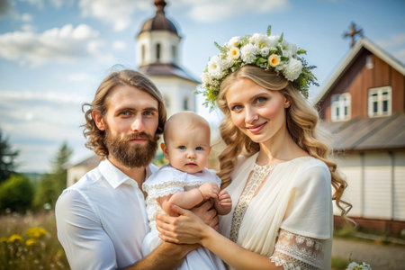 All-Russian day of family, love, fidelity. A man and a woman with daisies with a baby in their arms against the background of an Orthodox church. Valentine's Day of Peter and Fevronia.