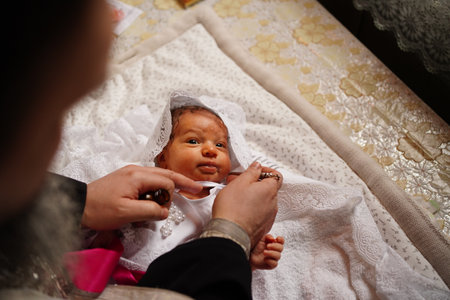Intimate moment of religious sacrament, an Eastern Orthodox priest performing the anointing of a babys foot with holy oil during a baptism ceremony, focusing on faith