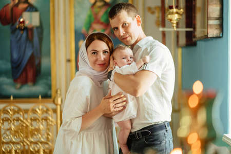 Belarus, Gomel, March 25. 2018. The Prudhkovsky Church. Baptism of the Child. Parents kiss the cross in the adoption of faith