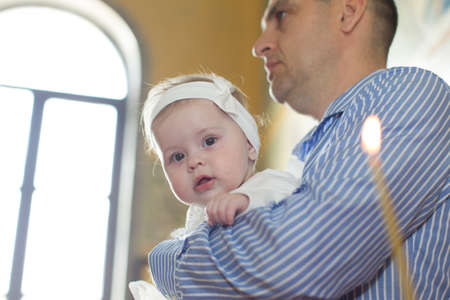 Belarus, Gomel, April 24, 2018. Church of Volotovo. A child on baptism.A child in a church in the hands of the godfather