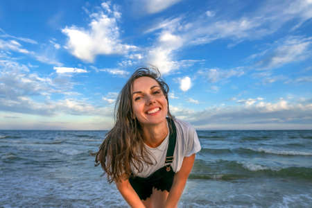 Pleased charming young woman at windy seacoast enjoy vacation. Pretty girl rest on evening sea beach with blue sky after sunset