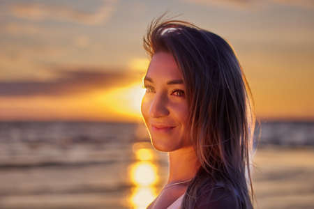 Close-up, the face of a beautiful happy woman against the background of the sea and dawn,