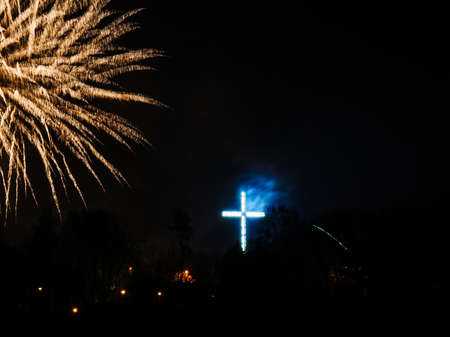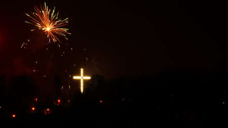 The cross is adorned with lamps at night, beside the road with bokeh traffic lights in northern province, Thailand.