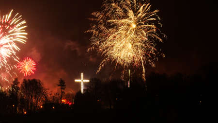 Crucifix Silhouette on Fire Flames Defocused Dark Background Slow Motion