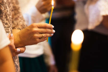 Close up view at somebody's hands set fire to a wax candle in the church