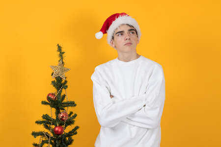 young teenage man with santa claus hat and christmas tree on color background