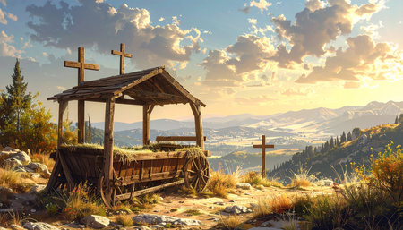 A rustic wooden cart sits under a simple shelter on a hill, with three crosses nearby, overlooking a vast mountain landscape at sunset.