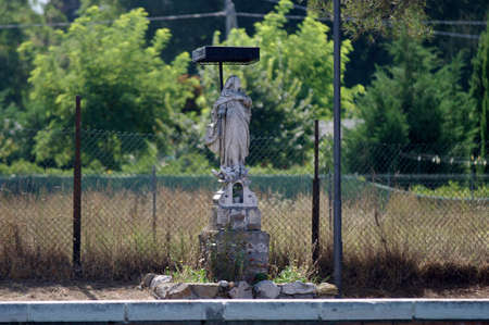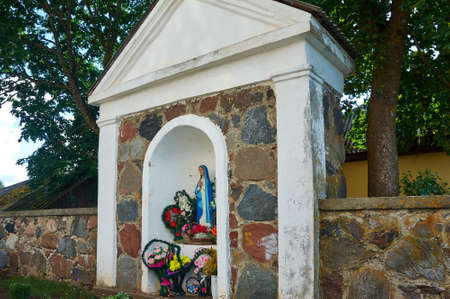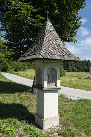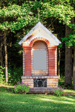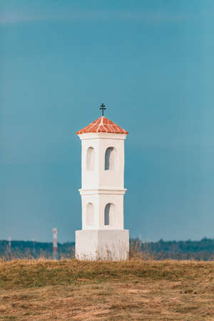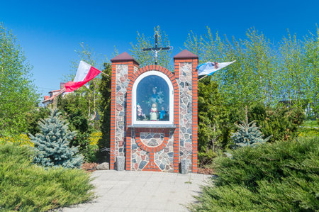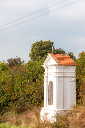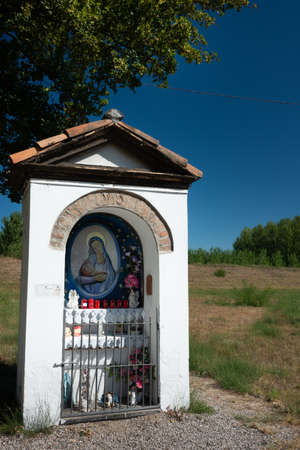 small chapel (roadside shrine) next to the road. Silesian area of Poland, Racibórz. Blue sky, sunny day, summer.