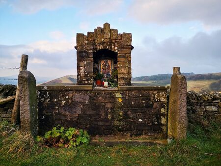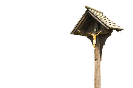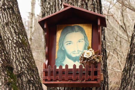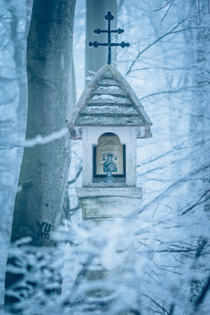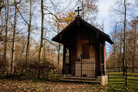 Typical old Christian wayside shrine at a country little forest in Belgium.