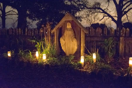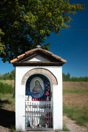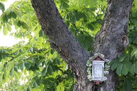 Votive aedicula devoted to the Blessed Virgin Mary on a tree near the medieval countryside church of Campanile, located in the village of Santa Maria in Fabriago in Emilia Romagna region in northern Italy