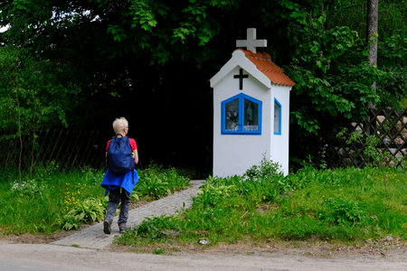 Little white chapel with blue window and silhouette of woman with backpack next to it in Debiny, Warmia, Poland