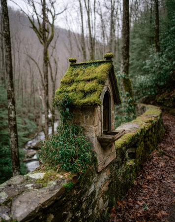 A stone structure with a moss-covered roof and wooden accents stands in a tranquil forest. The image showcases natural textures with a focus on green and brown hues. The composition may be suitable for editorial content, websites, and a variety of creative projects.