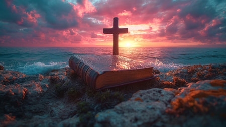 A wooden cross stands beside an open book on a textured surface. The soft lighting highlights the peaceful atmosphere, inviting contemplation and reflection.