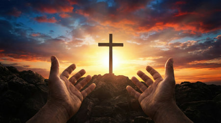 A first person perspective of hands lifted in praise towards a Christian cross on a mountaintop during a vibrant sunrise, symbolizing faith, hope, and salvation.