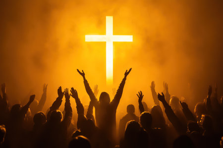 A congregation of people is silhouetted against a bright, central light source, raising their hands toward a cross. The scene is illuminated by an overhead spotlight, creating a dramatic, ethereal atmosphere. The image showcases textures, contrasts, and a composition ideal for promotional content or editorial use in various media.