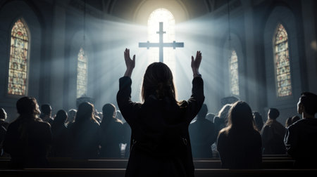 Capturing divine moments: church worship concept Christians, raised hands, earnestly pray and worship to cross in the sacred ambiance of a church building, expressing faith and spiritual connection