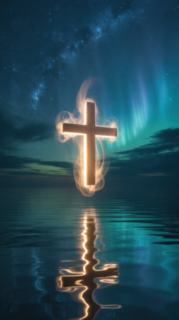 A wooden cross emits a bright golden glow, floating above dark, rippling water. The night sky features stars and a vibrant aurora borealis.