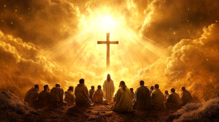 Jesus christ and his disciples in prayer under divine light with a prominent cross symbolizing faith