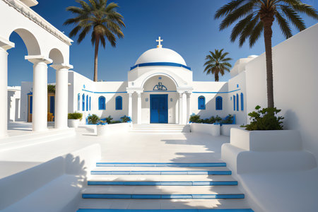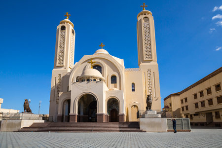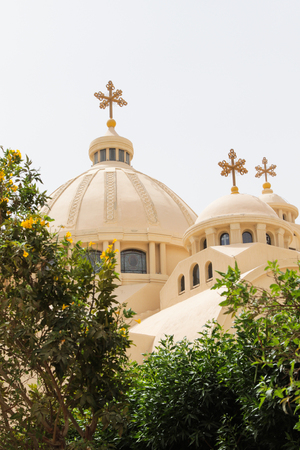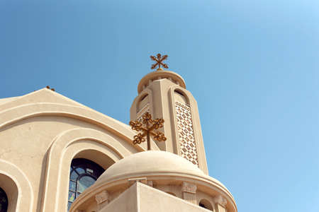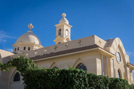Coptic Orthodox Church in Sharm El Sheikh, Egypt.Against the backdrop of a beautiful sky with clouds. All Saints Church. Concept of the righteous faith.