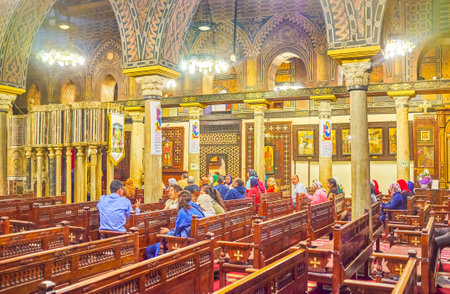 CAIRO, EGYPT - DECEMBER 23, 2017: The panoramic view on the interior of the Hanged Church with groups of tourists sitting on the benches, on December 23 in Cairo