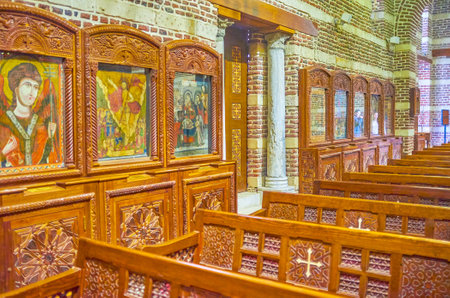 CAIRO, EGYPT - DECEMBER 23, 2017: The beautiful ancient Byzantine style icons in the prayer hall of St Barbara Church, on December 23 in Cairo.